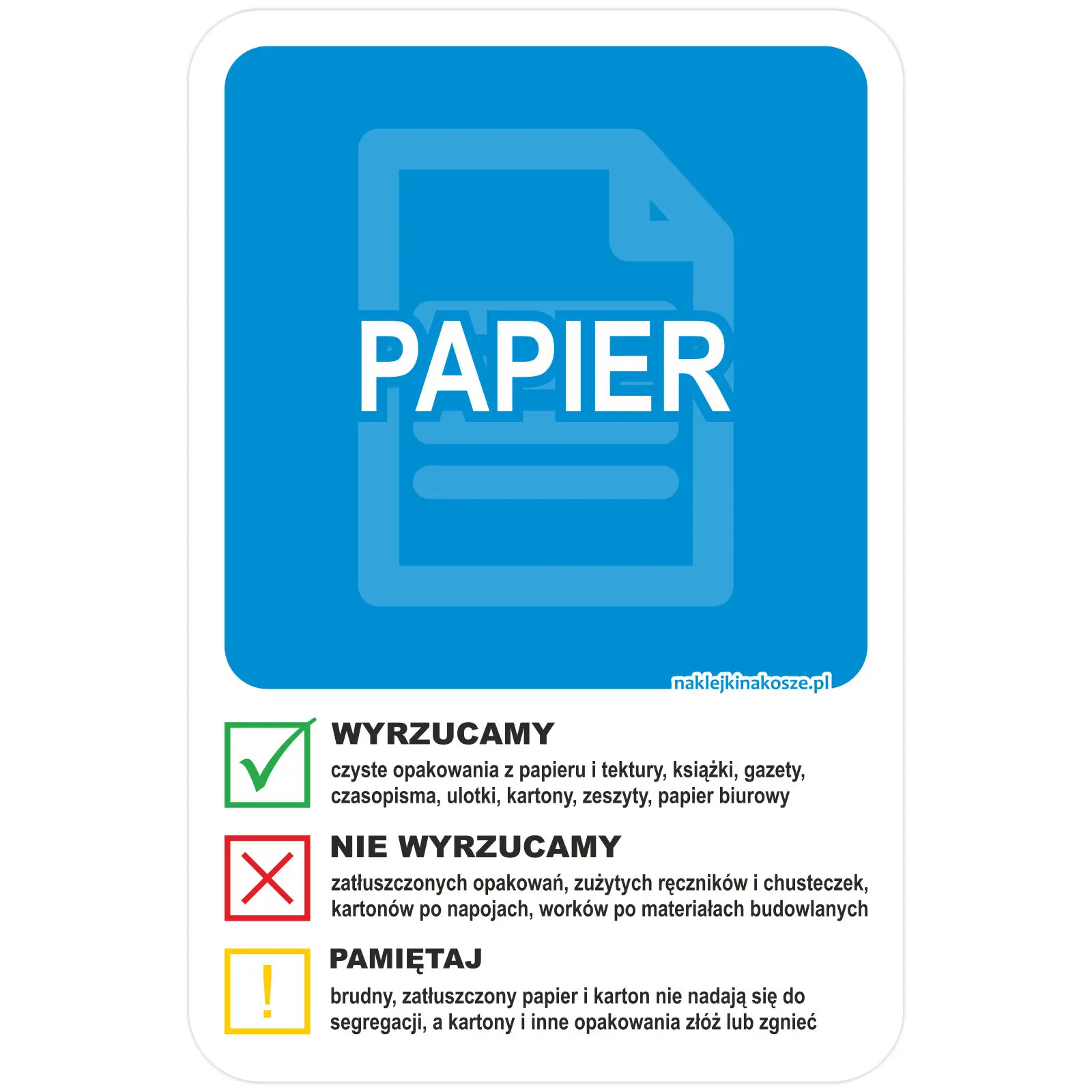 Naklejka zawiera również instrukcję segregacji, która wskazuje jakie odpady papierowe można wyrzucać do pojemnika.