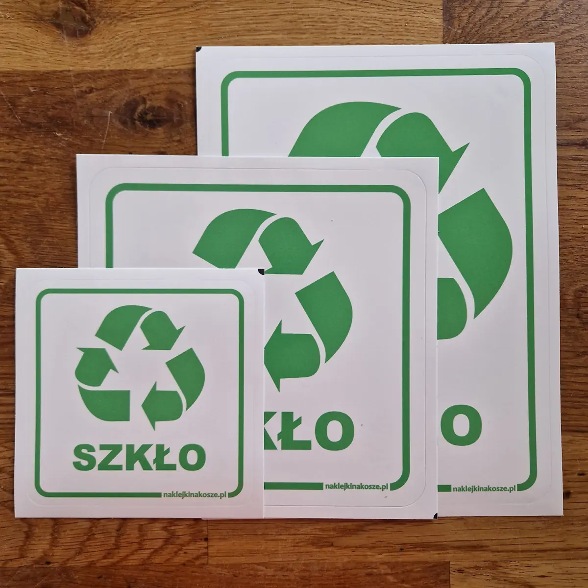 Biała naklejka z wyraźną, zieloną grafiką recyklingu to czytelne i estetyczne oznaczenie kosza przeznaczonego na szkło (odpady szklane). Kontrastowe kolory sprawiają, że oznaczenie jest dobrze widoczne zarówno w pomieszczeniach, jak i w przestrzeni zewnętrznej.