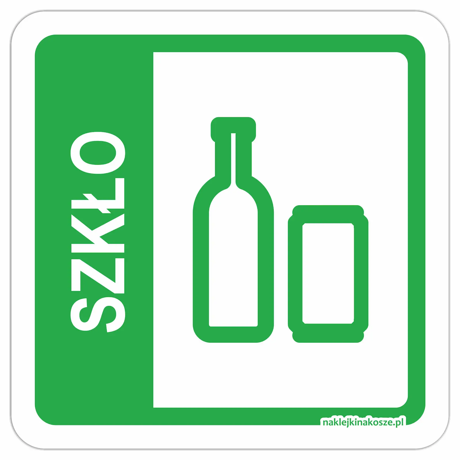 Naklejka na kosz Szkło to czytelne oznaczenie pojemnika przeznaczonego na odpady szklane. Piktogram oraz nazwa frakcji umożliwiają szybkie rozpoznanie właściwego kosza i ułatwiają prawidłową segregację.