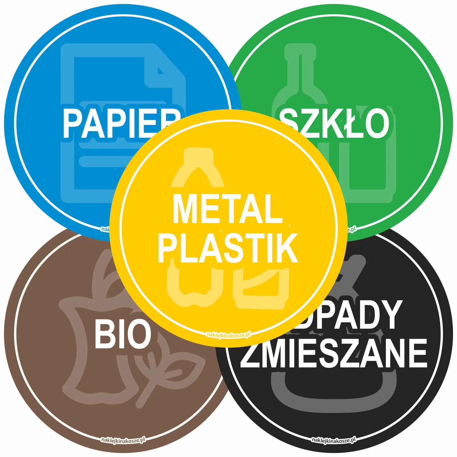 Zestaw 5 okrągłych naklejek do segregacji odpadów: Metal i Plastik, Szkło, Papier, Bio oraz Odpady zmieszane. Intensywne, kolorowe tło i biała grafika zapewniają wysoką czytelność i estetyczne oznaczenie koszy. Wykonane z trwałej folii samoprzylepnej, odpornej na warunki atmosferyczne.